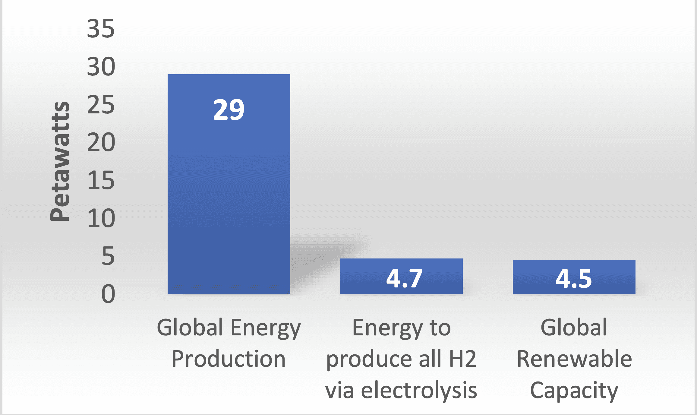 According to the International Energy Agency (IEA), global renewable energy capacity will be roughly 4500 TW for 2024. [10] Even if 100% of global renewable energy was redirected to producing green hydrogen, we would still be 200 TW short – and that is without considering the significant increases in global hydrogen demand that will be needed to decarbonize other hard to-abate industries such as steel, aviation, and long-haul transportation.